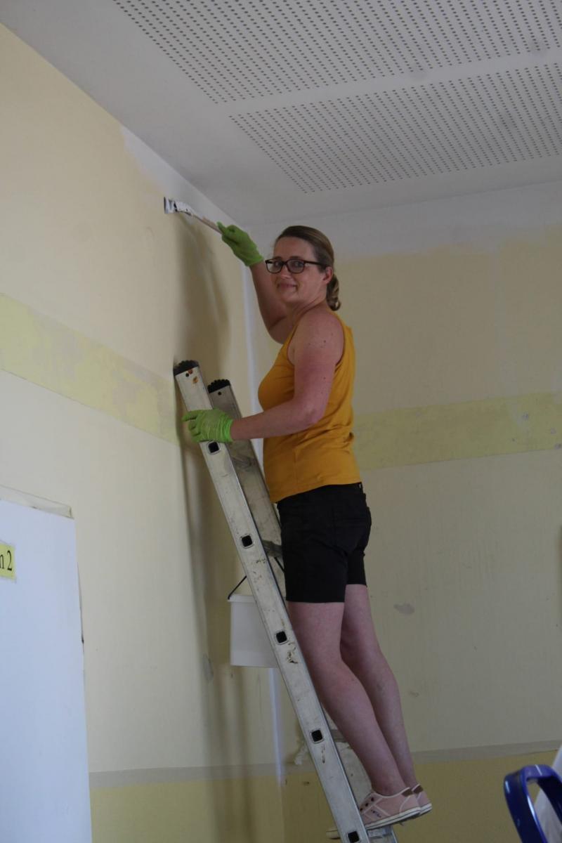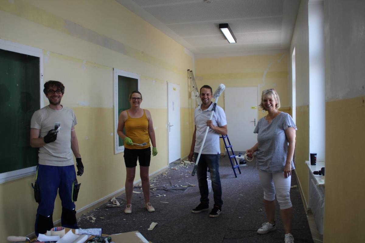 Die Sommerferien nutzten die Kolleginnen und Kollegen nicht nur zum Erholen, sondern auch für einen neuen Anstrich. An zwei Tagen wurde fleißig gearbeitet. Die hartnäckigen Bordüren auf dem Flur der Klassen 1 und 2 wurden entfernt, es wurde gespachtelt und in den Farben weiß und blau neu gestrichen.