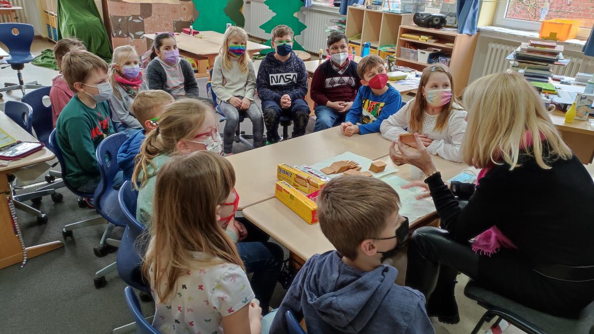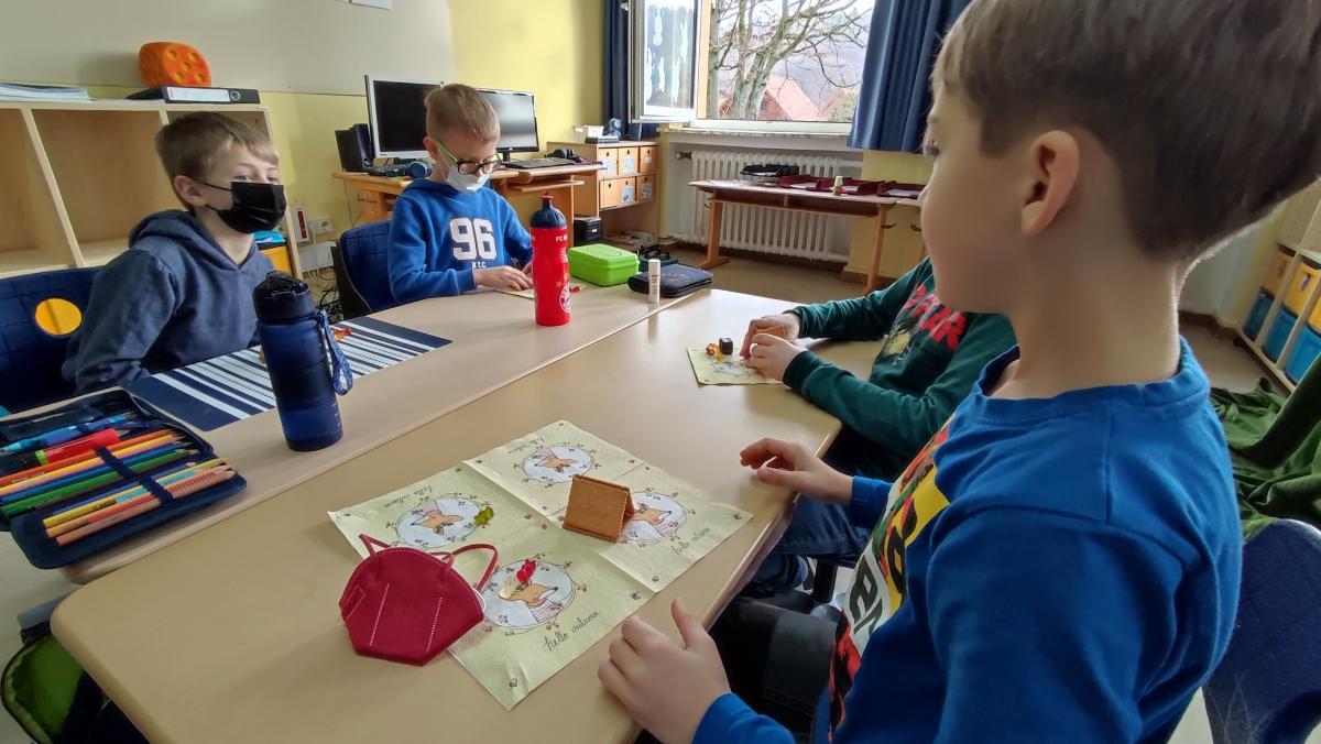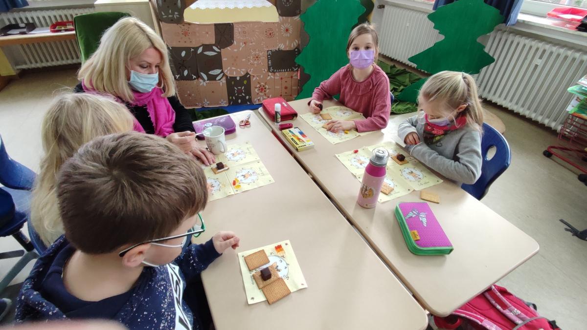 Mit der 2. Klasse ging es in den Märchenwald. Es wurden Märchen geschaut, gelesen und gehört. Jeden Tag wurde ein bestimmtes Märchen der Gebrüder Grimm behandelt, dazu bastelten und malten die Zweitklässler Lebkuchenhäuser, setzten Märchentexte wieder zusammen und schlüpften anhand von kleinen Lesetexten in unterschiedliche Rollen.