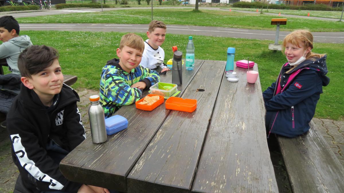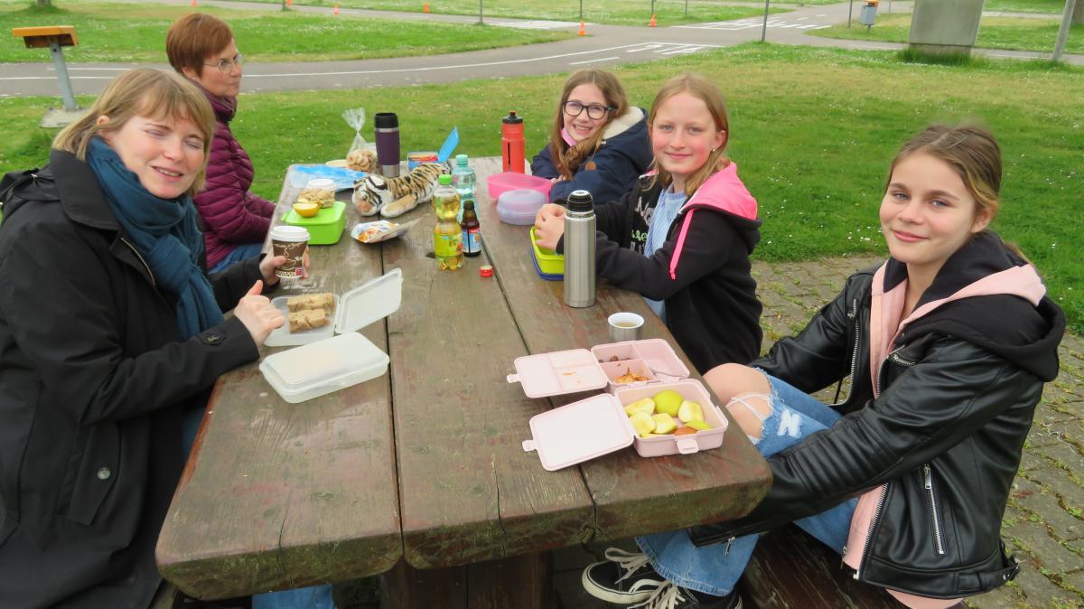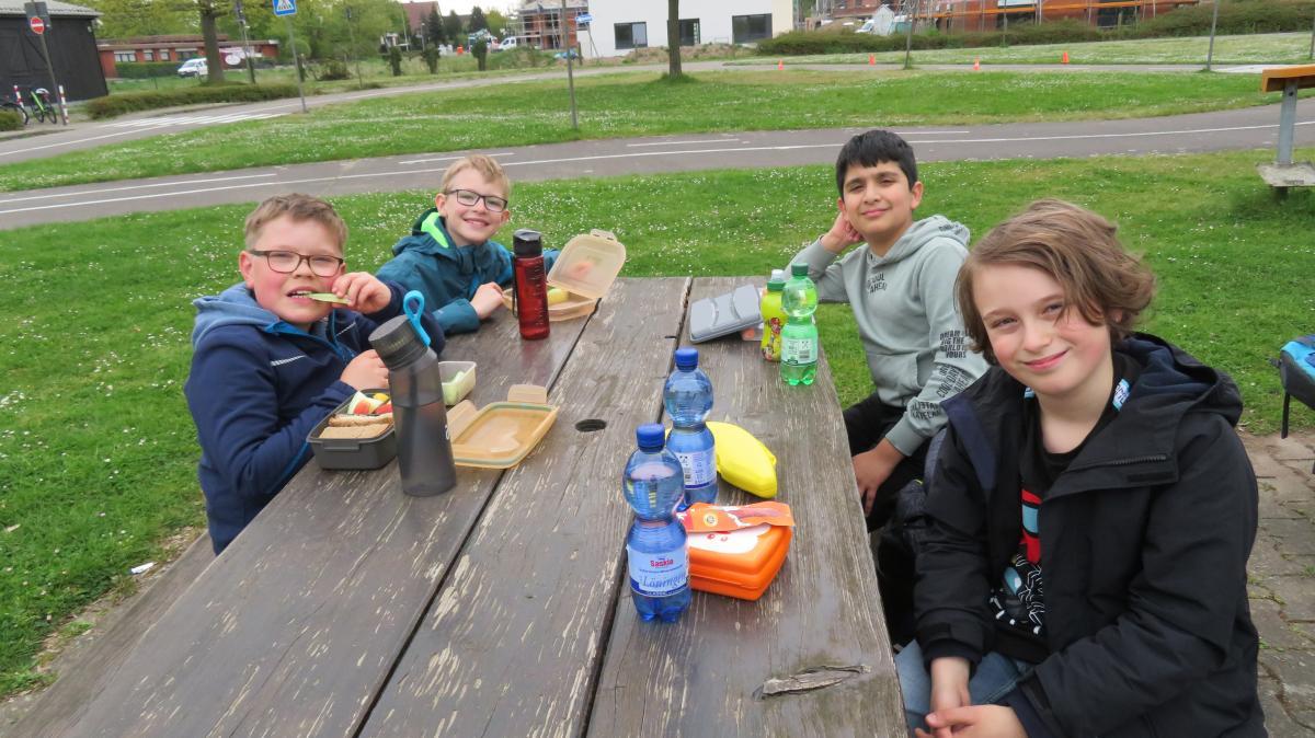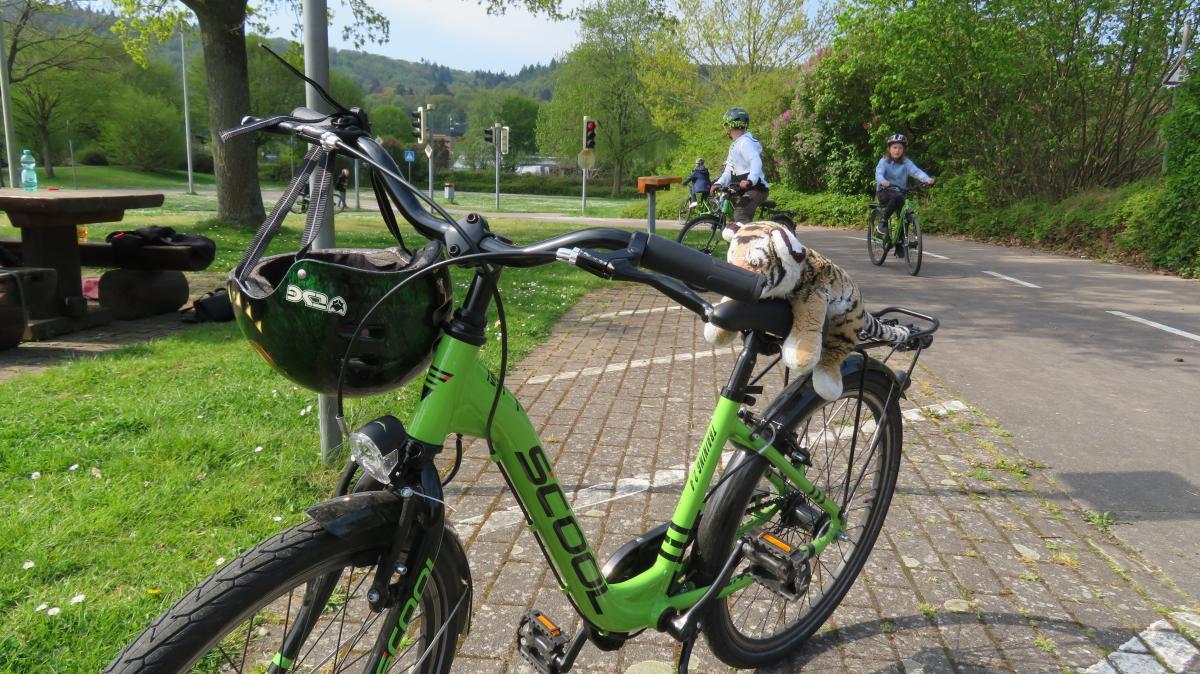 Anschließend haben alle mit ihren Leih-Fahrrädern geübt, richtig in den Straßenverkehr zu starten, an Stoppschildern, Zebrastreifen und Ampeln anzuhalten, links abzubiegen und ein Hindernis zu umfahren. Zwischendurch wurde auch noch ausgiebig gefrühstückt. Zum Schluss haben die Kinder verschiedene Geschicklichkeitsübungen und einen Langsamfahrwettbewerb absolviert.