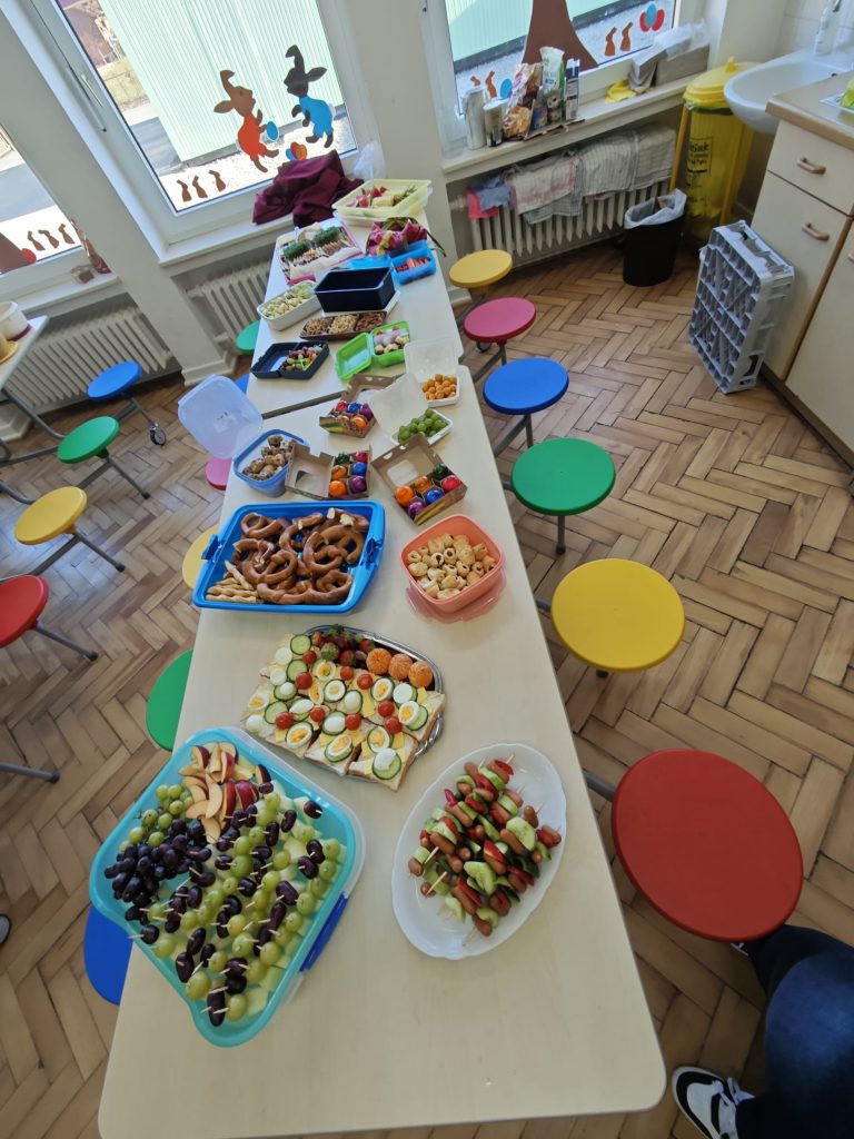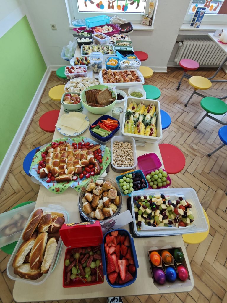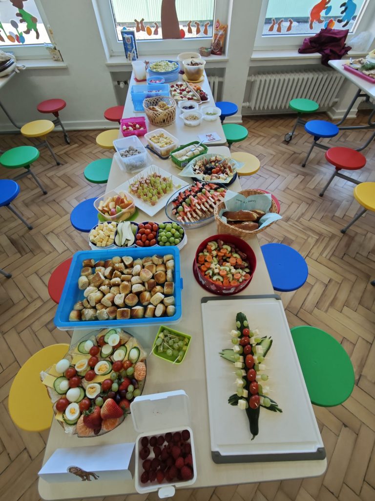 In der zweiten Stunde versammelten sich die Klassen nacheinander am liebevoll angerichteten Buffet und konnten sich nach Herzenslust bedienen. Begeistert probierten die Kinder immer wieder neue Leckereien und füllten ihre Teller erneut auf. Die Auswahl an frischem Obst, Gemüse, selbstgemachten Aufstrichen und anderen gesunden Köstlichkeiten ließ keine Wünsche offen.