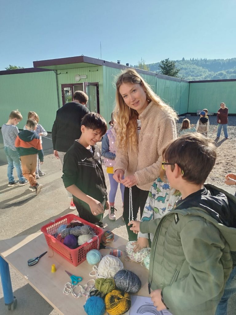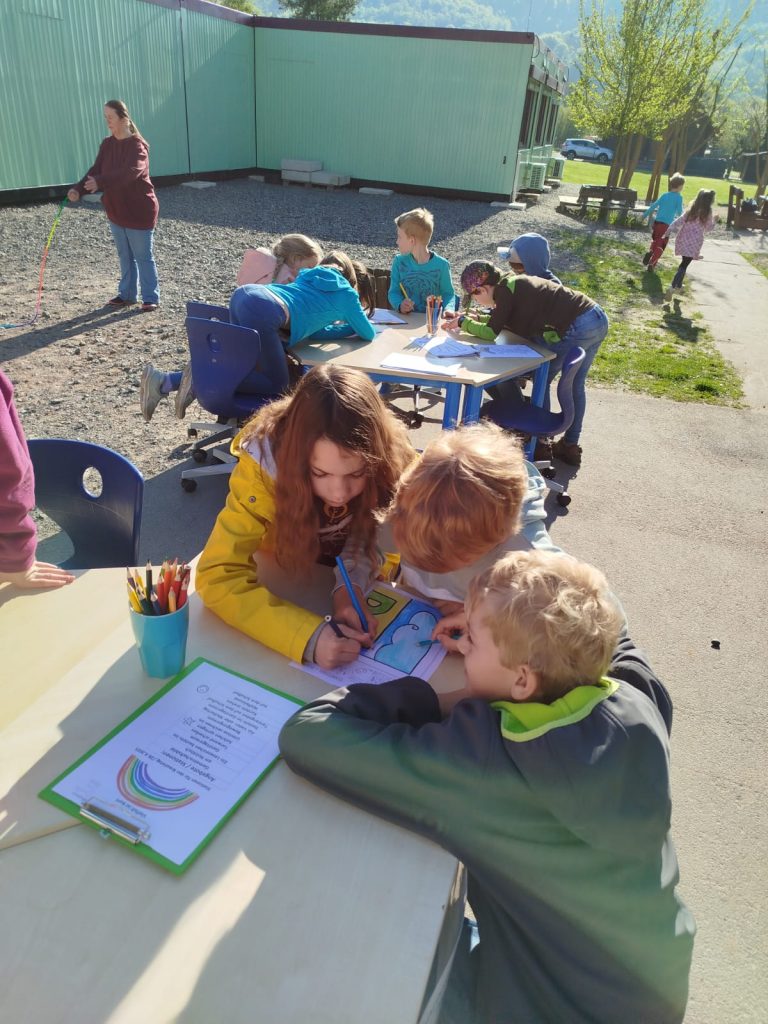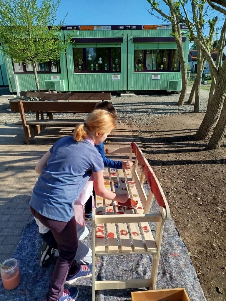Ab 8:30 Uhr wurde es dann richtig bunt: Bei strahlendem Sonnenschein machten sich die Kinder in kleinen Gruppen daran, die Bänke auf dem Pausenhof zu bemalen. Während immer eine Gruppe an der jeweiligen Bank arbeitete, beschäftigten sich die anderen an verschiedenen Mitmachstationen. Dort konnte man unter anderem ein Gemeinschaftsbild gestalten, Seilspringen, an der Torwand schießen und vieles mehr.