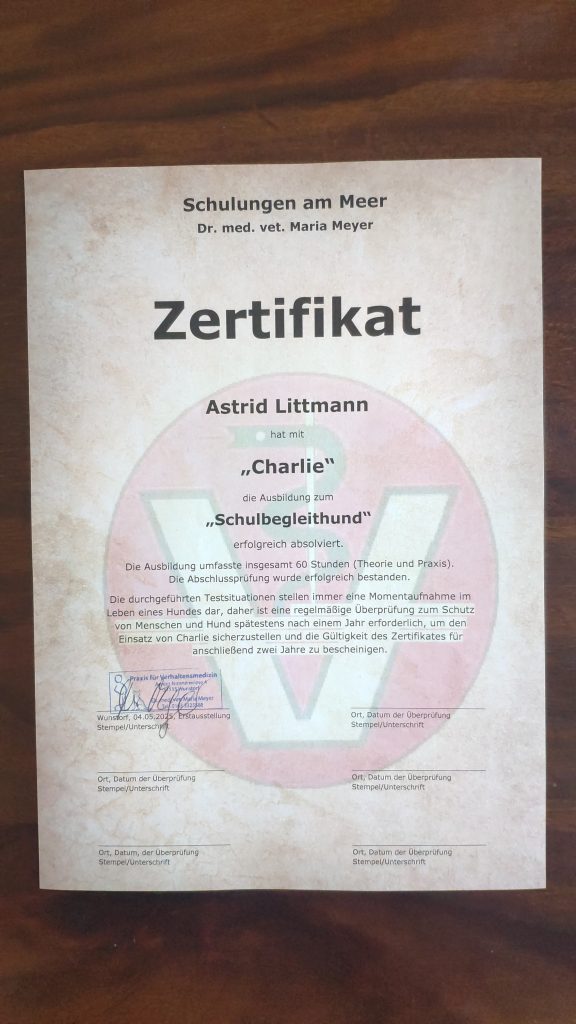 Nach 4 Monaten mit insgesamt 60 Stunden theoretischer und praktischer Ausbildung haben Frau Littmann und ihr Hund Charlie am 04. Mai 2025 die Abschlussprüfung der Schulhund-Ausbildung bestanden. Das Zertifikat wurde für ein Jahr ausgestellt und wird dann durch eine weitere praktische Prüfung erneuert. Wir freuen uns sehr, dass Charlie sich nun auch offiziell als „Schulbegleithund“ bezeichnen darf und in der Tigerklasse weiter mit viel Spaß als Co-Pädagoge mitarbeiten kann.